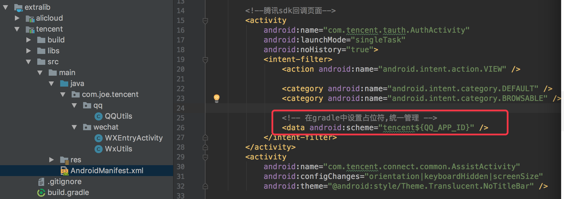 manifestPlaceholders = [QQ_APP_ID: this.ext.tencent.QQ_APP_ID]这样就依旧可以保证全局只依赖appConfig中的QQ_APP_ID.