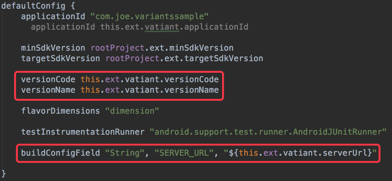 这里简单解释一下:rootProject.ext获取的是根module下gradle内的ext中定义的参数 this.ext则指的是引用的appConfig.而且大家也可以看到我很省事儿的直接将应该在Flavor中定义的versionCode.versionName.SERVER_URL都直接写在了defaultConfig中了.只有applicationId还在Flavor中定义.(ps.applicationId不能在defaultConfig中,debug编译有可能会出现先后编译错误.可在项目中查看)
