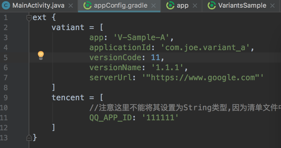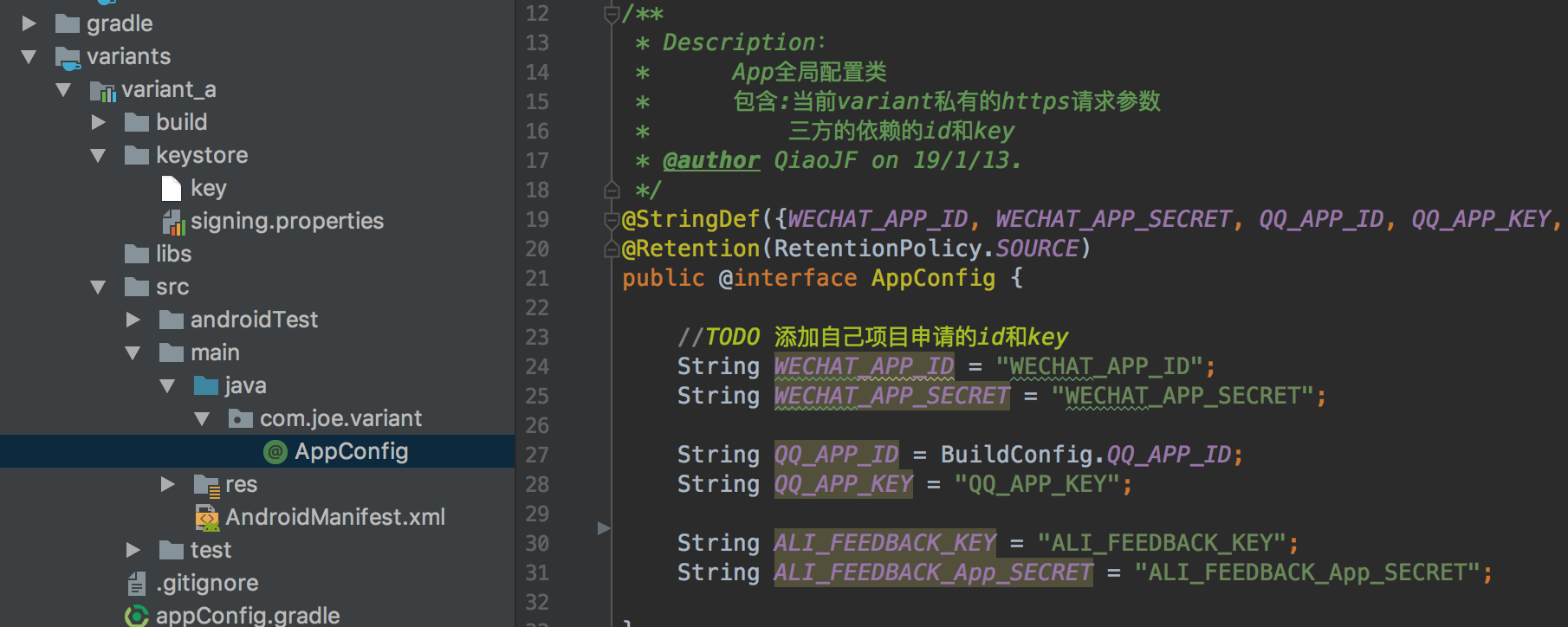 apply from: String.format('../variants/%1$s/appConfig.gradle', rootProject.ext.currentFlavor)这样我们就可以动态的拿到当前编译的Flavor的appConfig.如何就可以愉快的配置了.