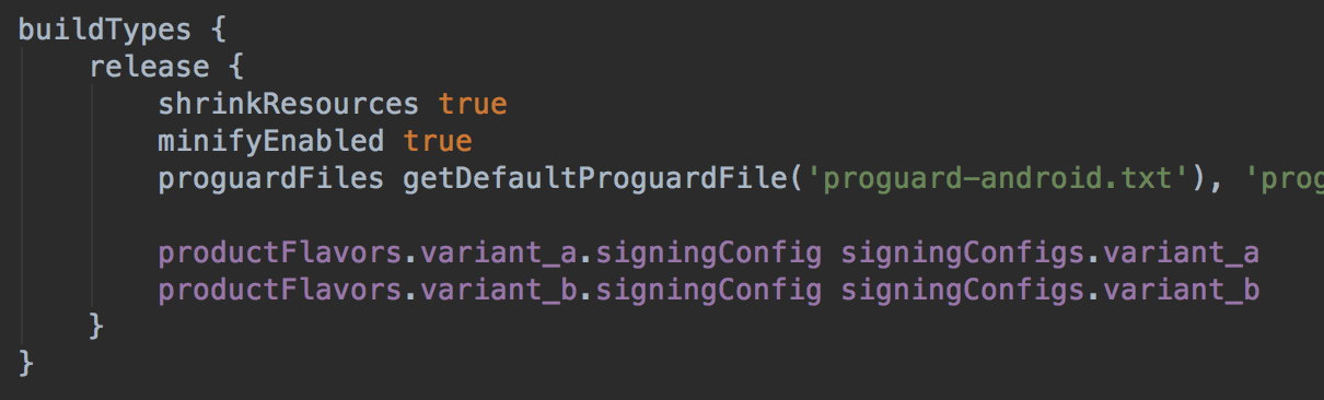 final String keyPath = String.format('../variants/%1$s/keystore/key', rootProject.ext.currentFlavor)然后,需要为其配置独立的签名验证