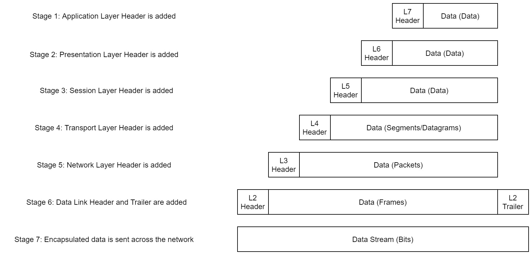 As the data is passed down each layer of the model, more information containing details specific to the layer in question is added on to the start of the transmission. As an example, the header added by the Network Layer would include things like the source and destination IP addresses, and the header added by the Transport Layer would include (amongst other things) information specific to the protocol being used. The data link layer also adds a piece on at the end of the transmission, which is used to verify that the data has not been corrupted on transmission; this also has the added bonus of increased security, as the data can't be intercepted and tampered with without breaking the trailer. This whole process is referred to as encapsulation; the process by which data can be sent from one computer to another.