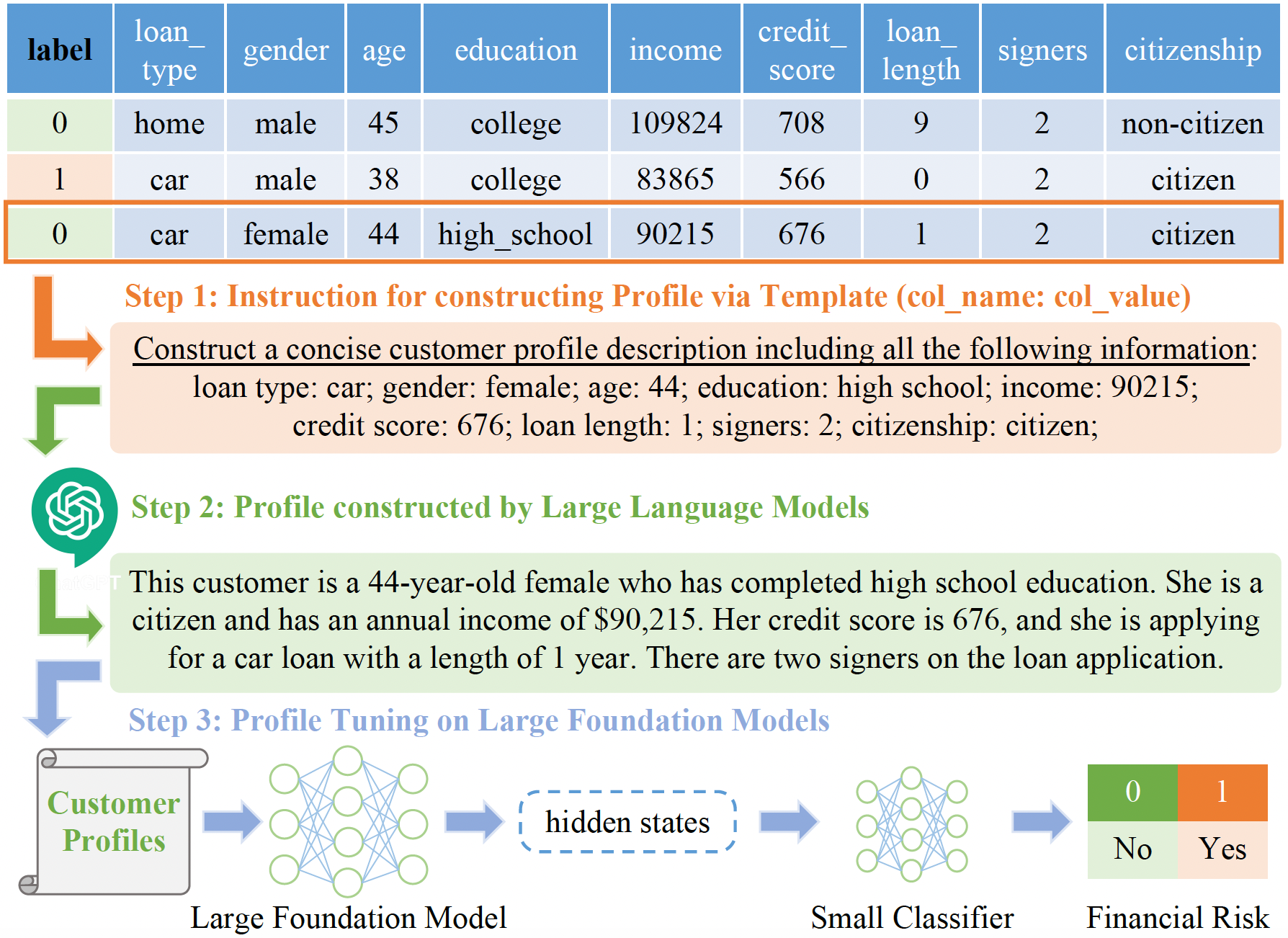 dataset = load_dataset("yuweiyin/FinBench", ds_name)The instructions obtained in Step 1 and customer profiles generated in Step 2