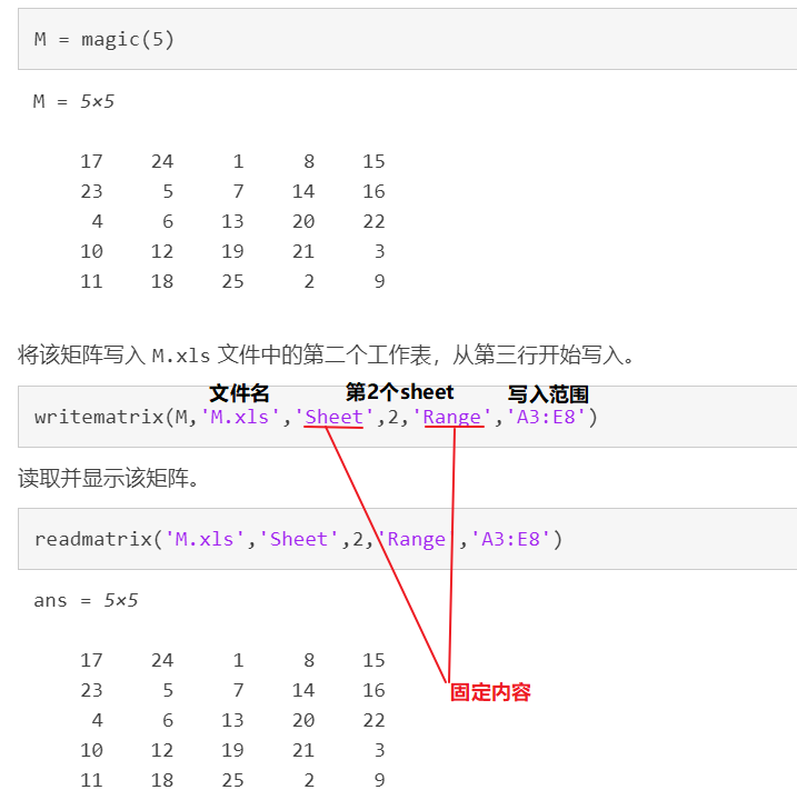 writematrix(M, 'M.xls', 'Sheet', 2, 'Range', 'A3:E8') 规定范围写入指定表格,注意参数列表中 sheet 后的参数可以是表格名也可以是第 x 个表格