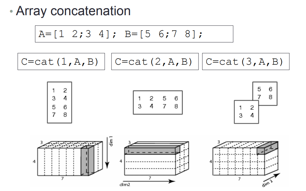 - 第一个参数为1:纵向串联,需要A、B两个矩阵行宽(列数)一致; 第一个参数为2:横向串联,需要A、B两个矩阵列宽一致; 第一个参数为3:前后三维串联,需要A、B两个矩阵行宽和列宽均一致;
