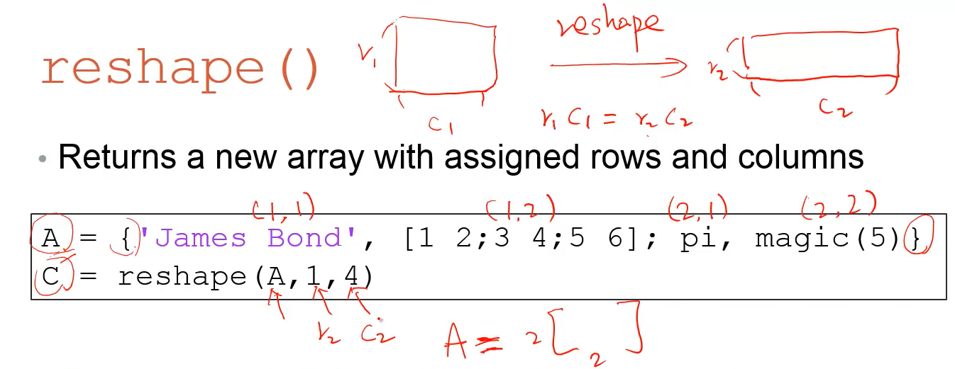 size(A, 1):第 1 维的长度,上图中 dim1 的宽度,即列宽;size(A, 2):第 2 维的长度,dim2 的宽度,行宽;size(A, 3):第 3 维的长度,dim3 的宽度 - reshape() 改变数组行列数: