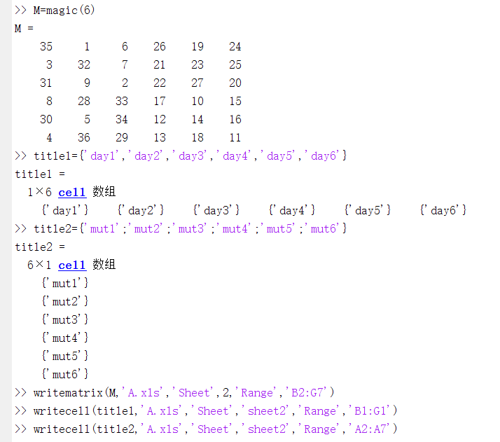 使用 writecell() 将 cell 写入 Excel 文档,调用格式与 writematrix() 一致;