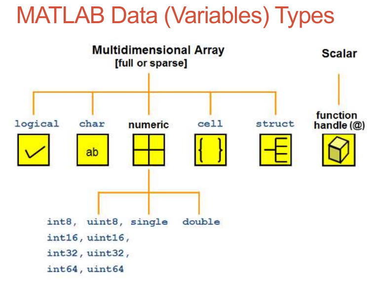 int需要显示指出位数,没有普通的int,对于float,对应matlab中的是single; - 默认情况下,matlab 将所有数值型的数据都存储为 double;