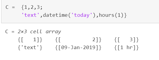 C = {, , ; , , }创建一个 2×3 的 cell,用来分隔 cell 中的列,;用来分隔 cell 中的行 -