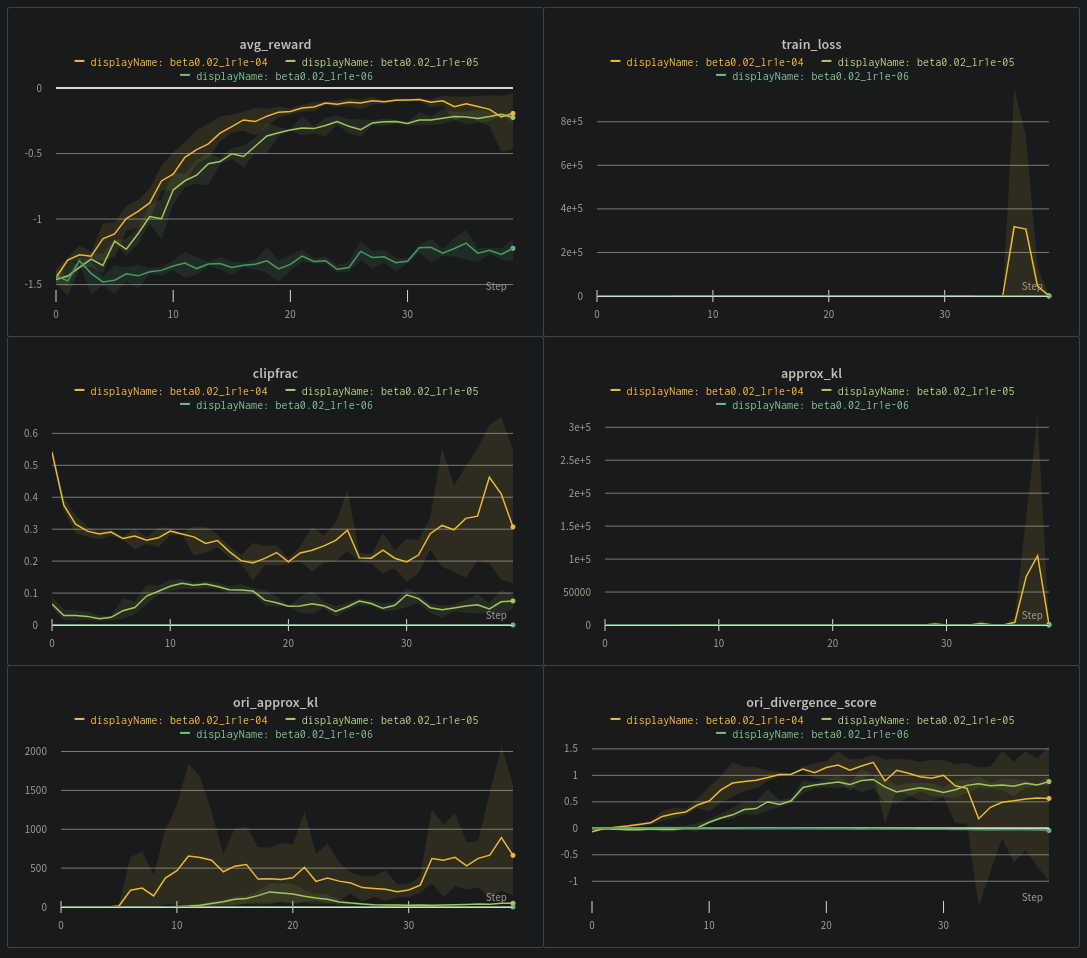 I selected the PPO avg_reward and reasonable clipfrac. The divergence from the original model is not too high. And the train loss looks stable. For PPO avg_reward and KL between the ppo model and pretrained model for investigation purpose.