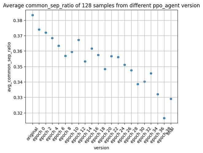 We can see clearly that the model starts to overoptimization since the sample in the end look gibberish and lack of structure. To measure it, I found the ratio of common separation tokens seems to be a good signal to indicate overoptimization. The common separation tokens are ["\n", " ", ",", ".",] and the intuition is that agent will start output positive token regardless of the sentence structure if it starts overoptimizing. So I plot the ratio and it shows the overoptimization seems to start after epoch 8.
