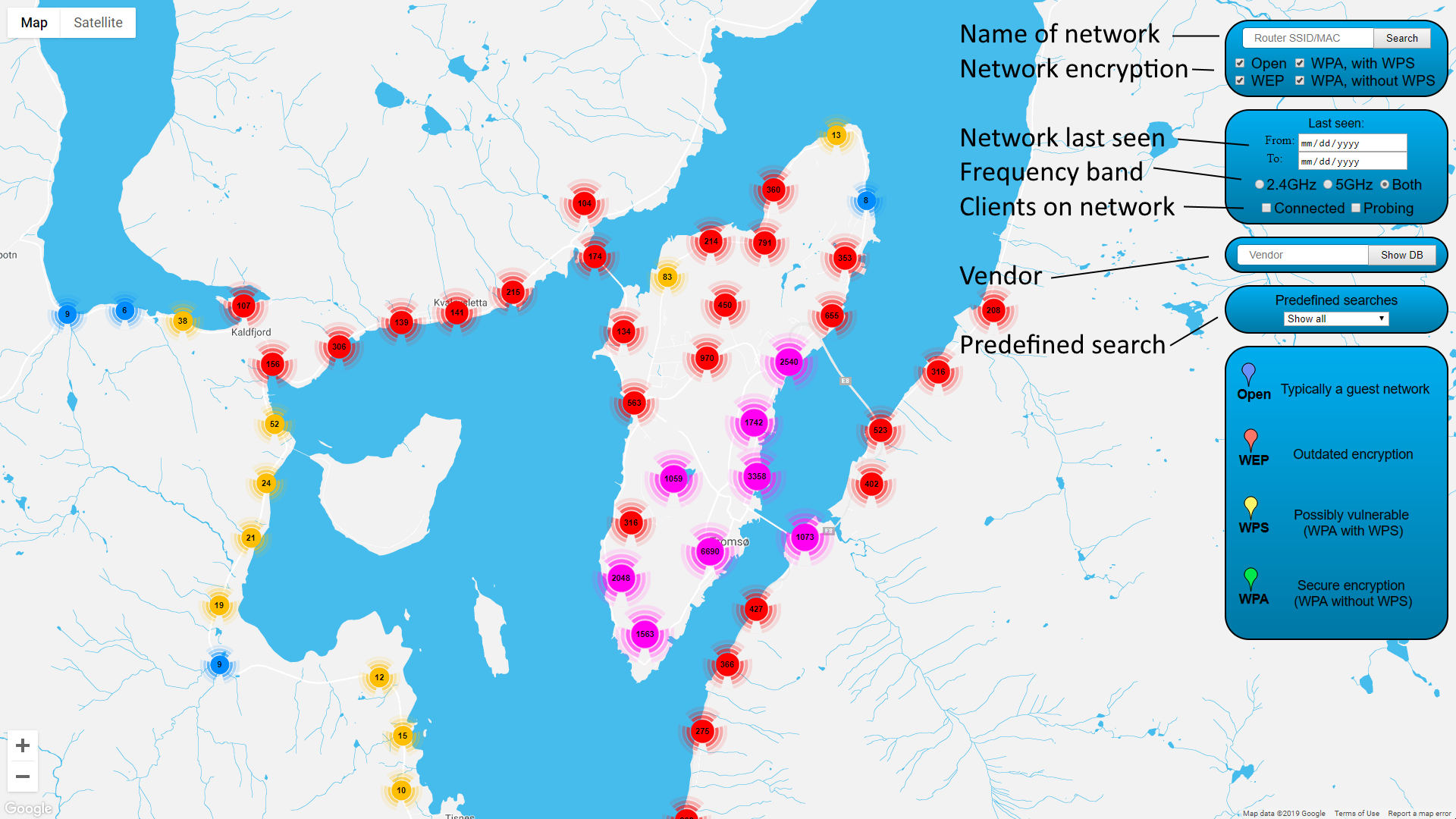 Put data captured by the WiGLE Android app in a self-hosted database, overlay it on Google Maps with extensive filtering options. Import data captured by airodump-ng, connect it with the data from WiGLE, and see which clients have been connected to or probed networks in your database.