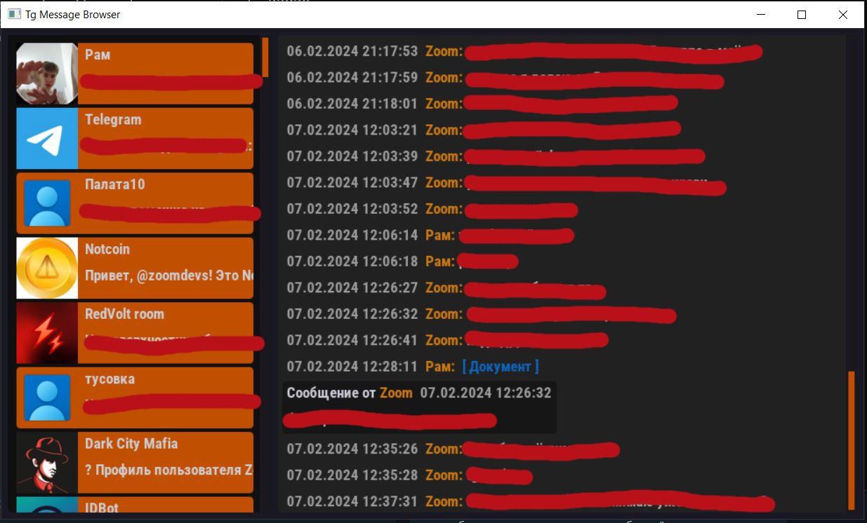 Это инструмент, который предоставляет удобный интерфейс для чтения диалогов в телеграме с использованием Telethon сессии. Поддерживается отображение изображений, ответов, пересланных сообщений, возможность скачать любой файл в диалоге.