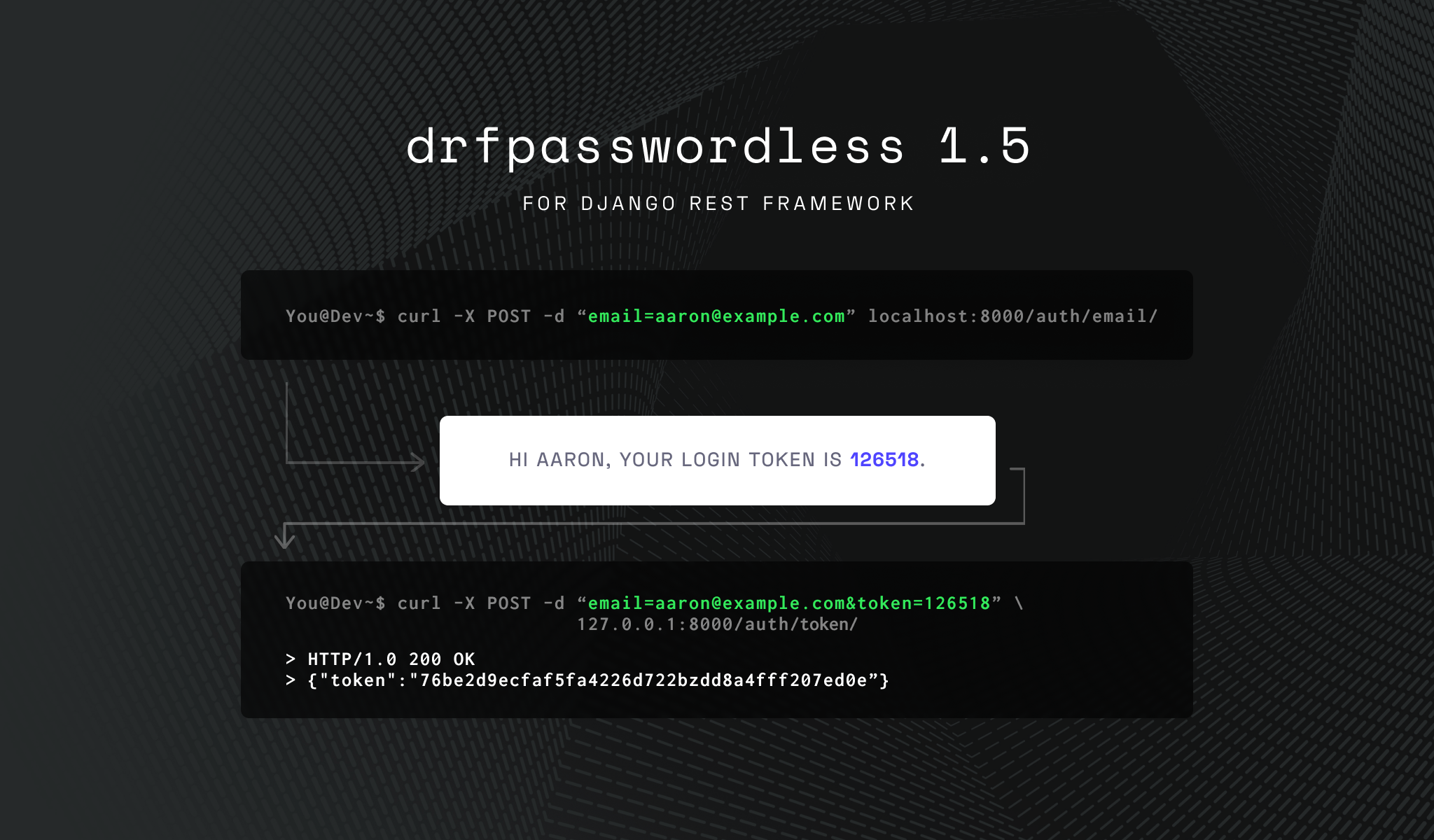 drfpasswordless is a quick way to integrate ‘passwordless’ auth into your Django Rest Framework project using a user’s email address or mobile number only (herein referred to as an alias).