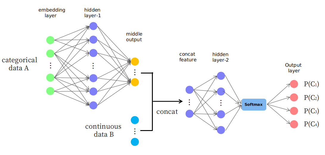 - The 1st network (NN-1) is trained on the tabular/relational dataset (all the attributes after feature engineering are categorical) with the actual labels.
