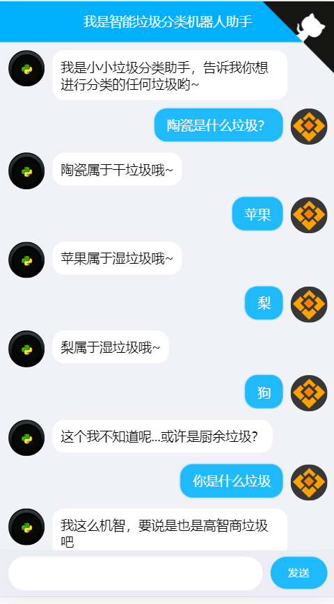 为了更好的垃圾分类,编写了一个智能回答小助手,数据来源于上海市垃圾查询爬取 与 福州第一技师学院的生活垃圾分类知识汇总