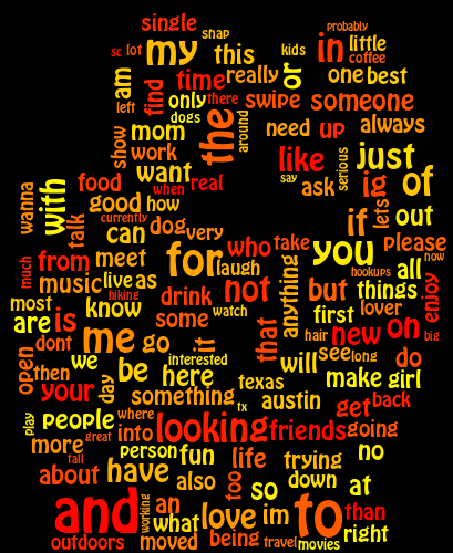 tinder_analysis.py, a script that provides basic statistics and a word cloud from the Excel workbook fromcard_data.py. - December 13th, 2021 - Added