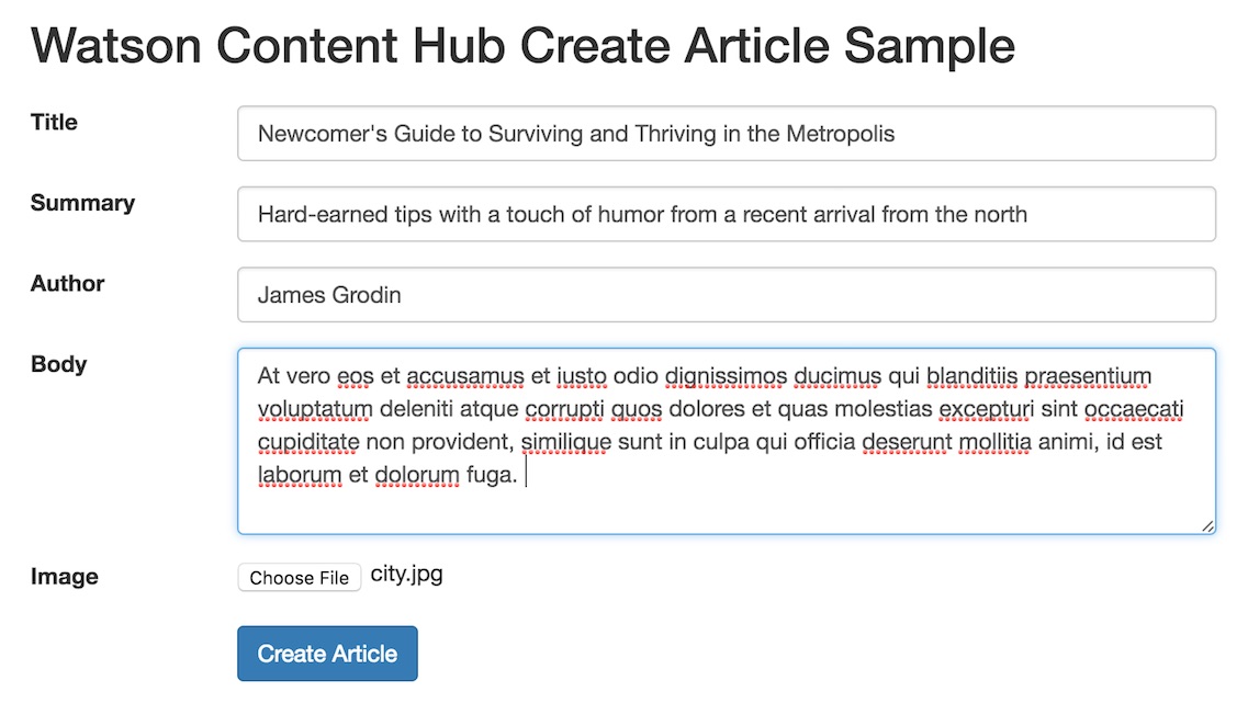 This is a sample of a custom web application for creating new "Article" content items with images in Acoustic Content (formerly Watson Content Hub or WCH). It also includes an example of how to update an existing content item which is in ready state.