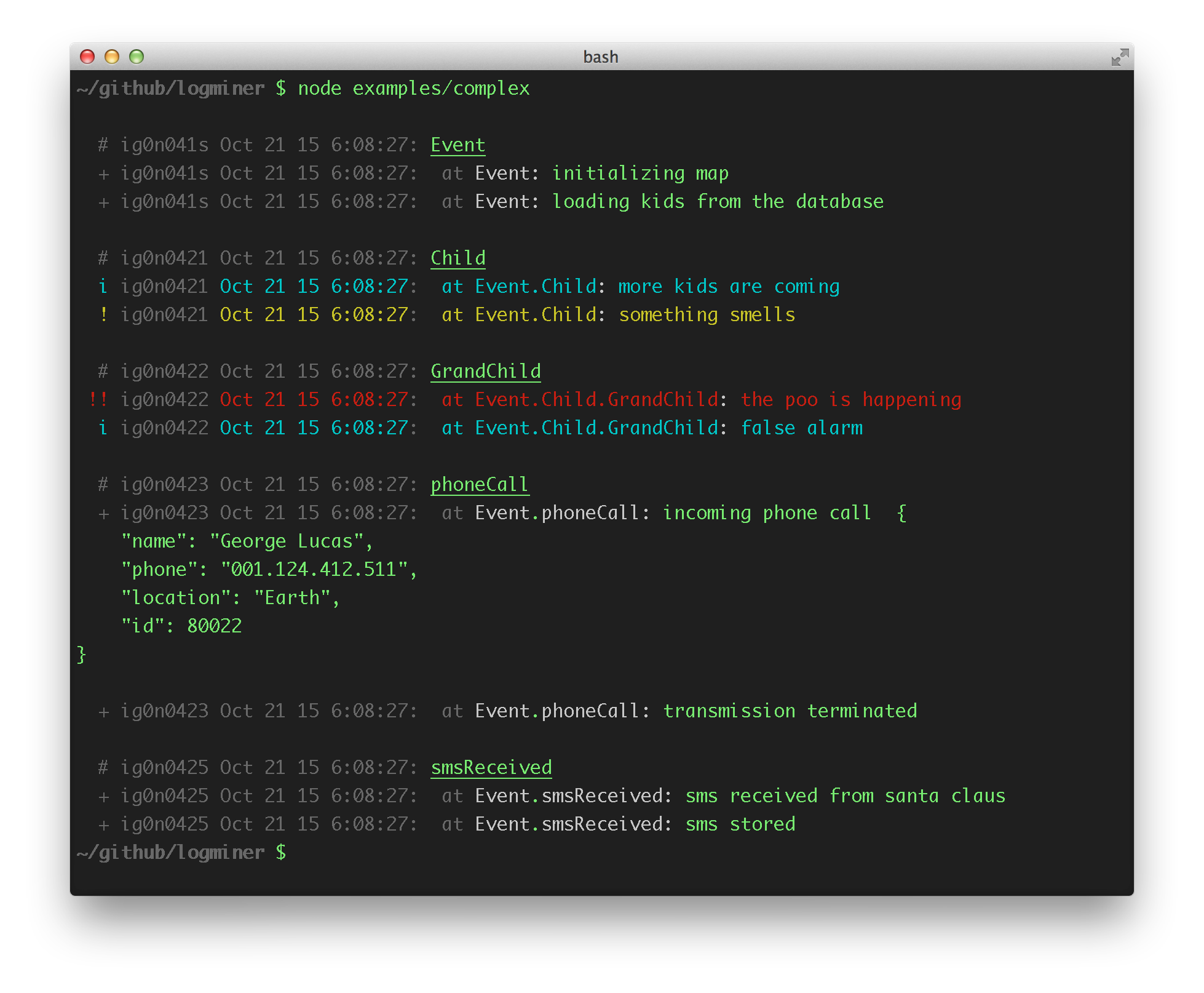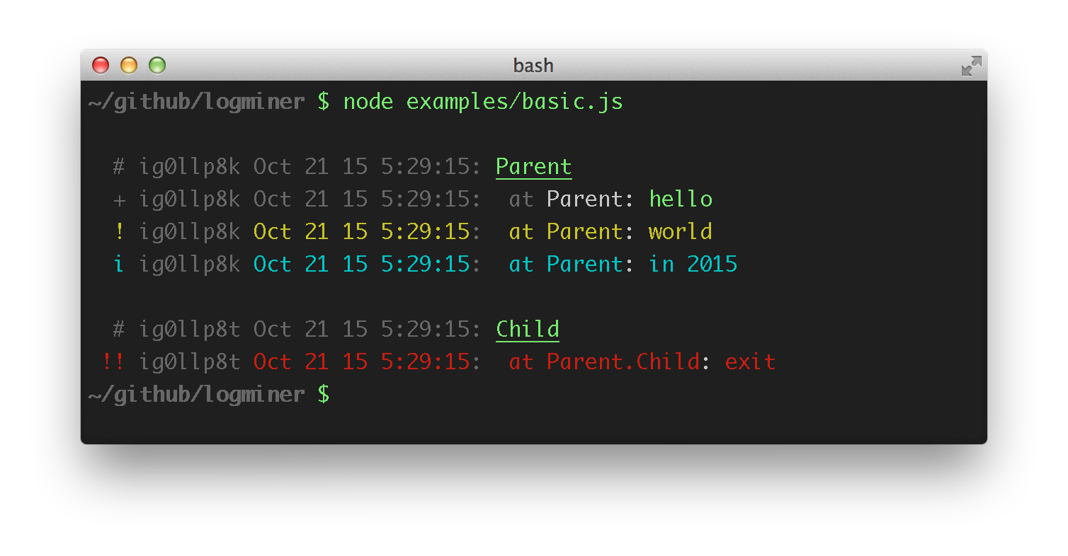 + ig0l4o2g Oct 21 15 5:16:01: at Parent: helloThis creates a child logger which inherits the Parent in every log produced with childlog.