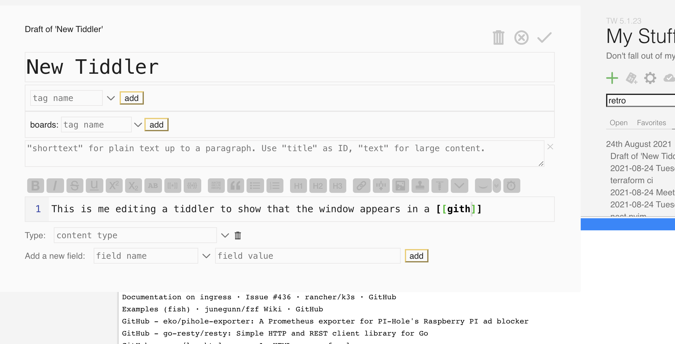I'm having an issue with the autocompletion window appearing behind the editor, so I am unable to see the list of tiddler titles to select the one I want. If the cursor close to the right edge of the edit box, I can see part of the list, but otherwise it is completely hidden.
