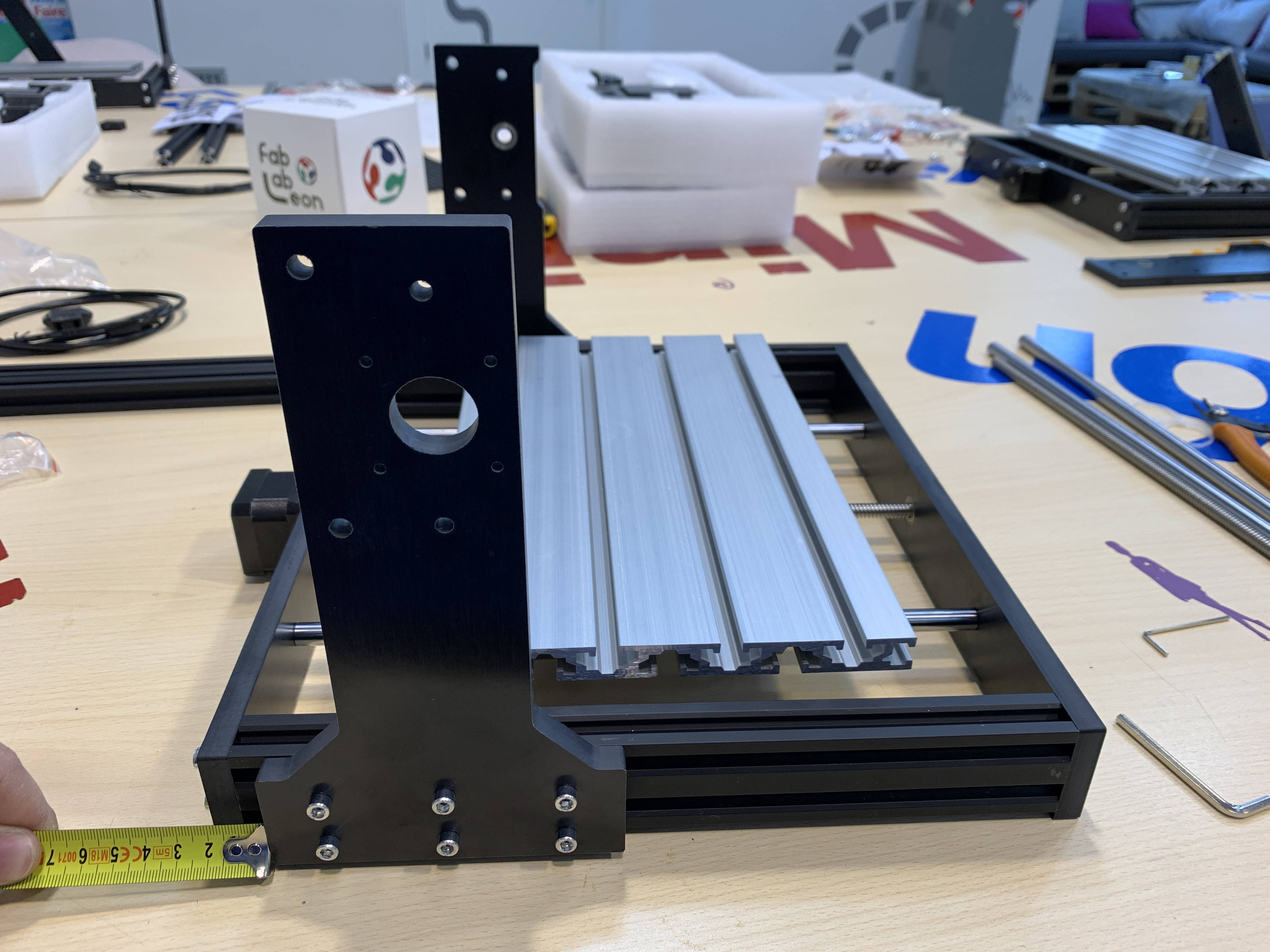 1. When assembling the structure, we will not tighten the screws until the end. The gray pieces where the aluminum sacrificial board will sit must be placed opposite as in the image. The motor coupling and the threaded rod must have a gap of 2 mm with the motor. Important the position of the golden piece and the spring.