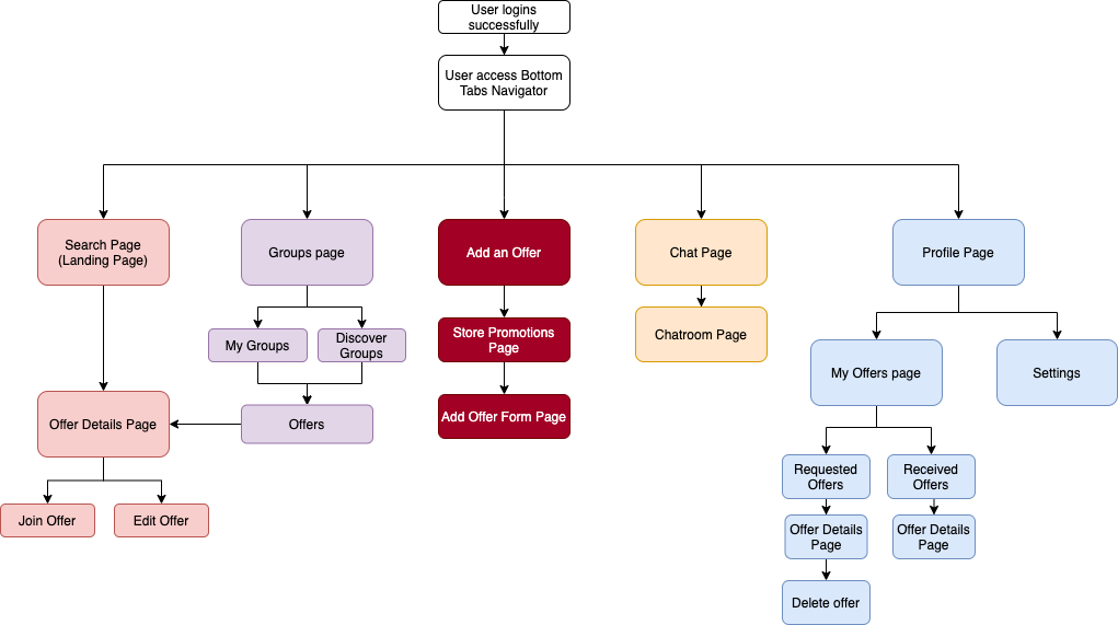 Upon successful login using user's email and password, they are brought to the main menu. The landing page will be the ‘Search’ page. There are a total of 5 tabs which the user can click on to use their features. Namely, the pages are: Search, Group, (Add) Offer, Chat, and Profile.