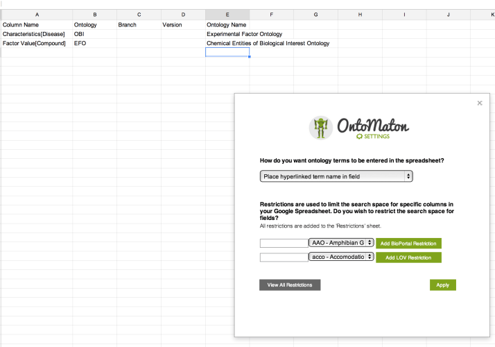 - Restrictions, which specify for zero or more columns (with a name in the first cell), restrictions that should be placed on the search space. E.g. Label is restriction to the chemical entities ontology (ChEBI).