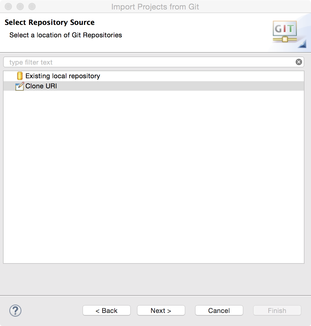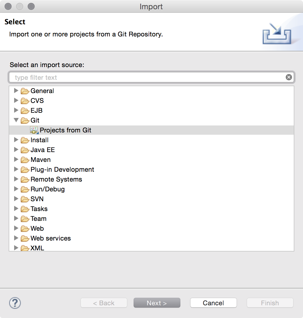 Select a wizard to use for importing projectsselect theImport existing projectsdialog (Note: this dialog may take a while to enable as it will be downloading a copy of the repository to your local drive):