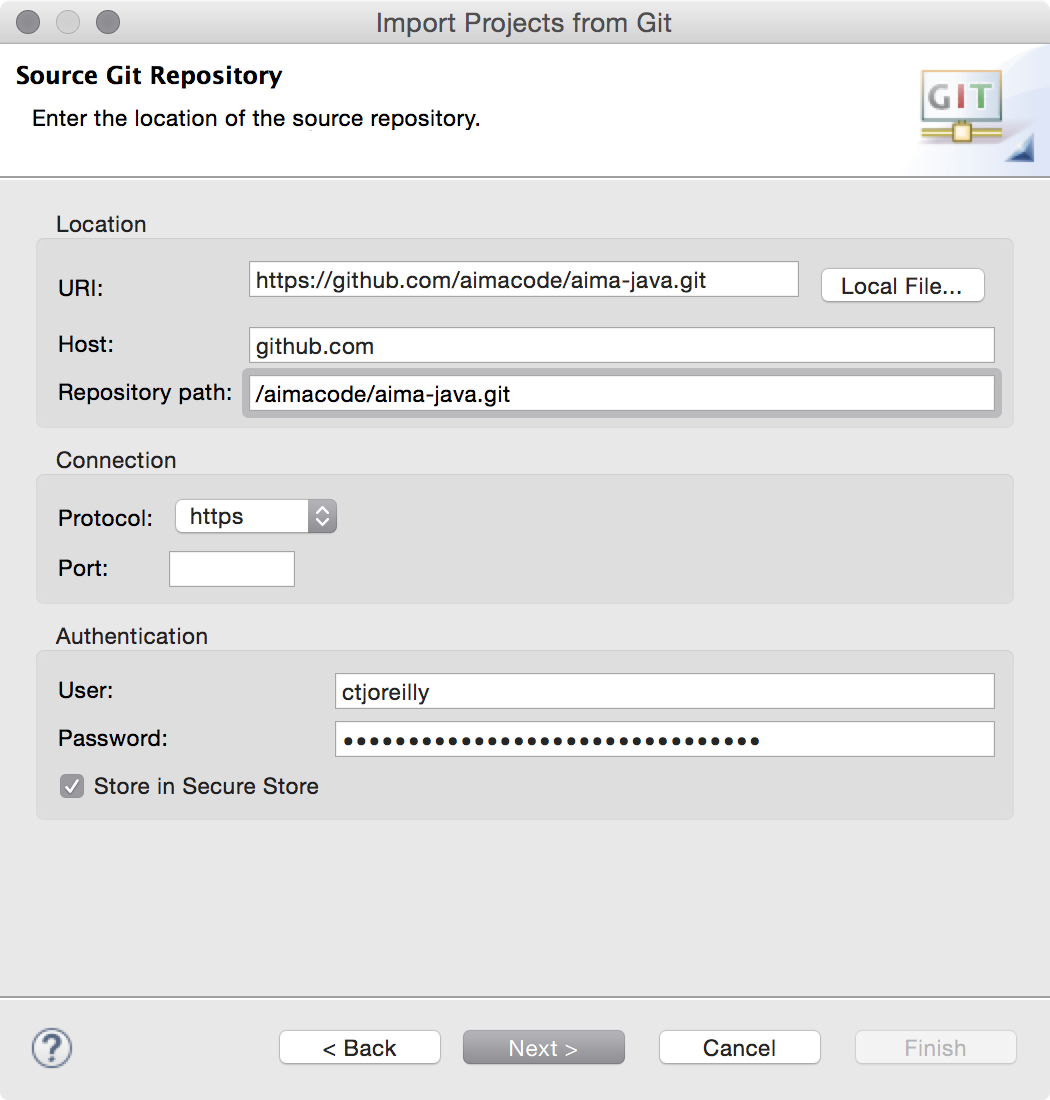 Source Git Repositorydialog enter the URIhttps://github.com/aimacode/aima-java.gitfor the project and your own GitHubUser:name andPassword::