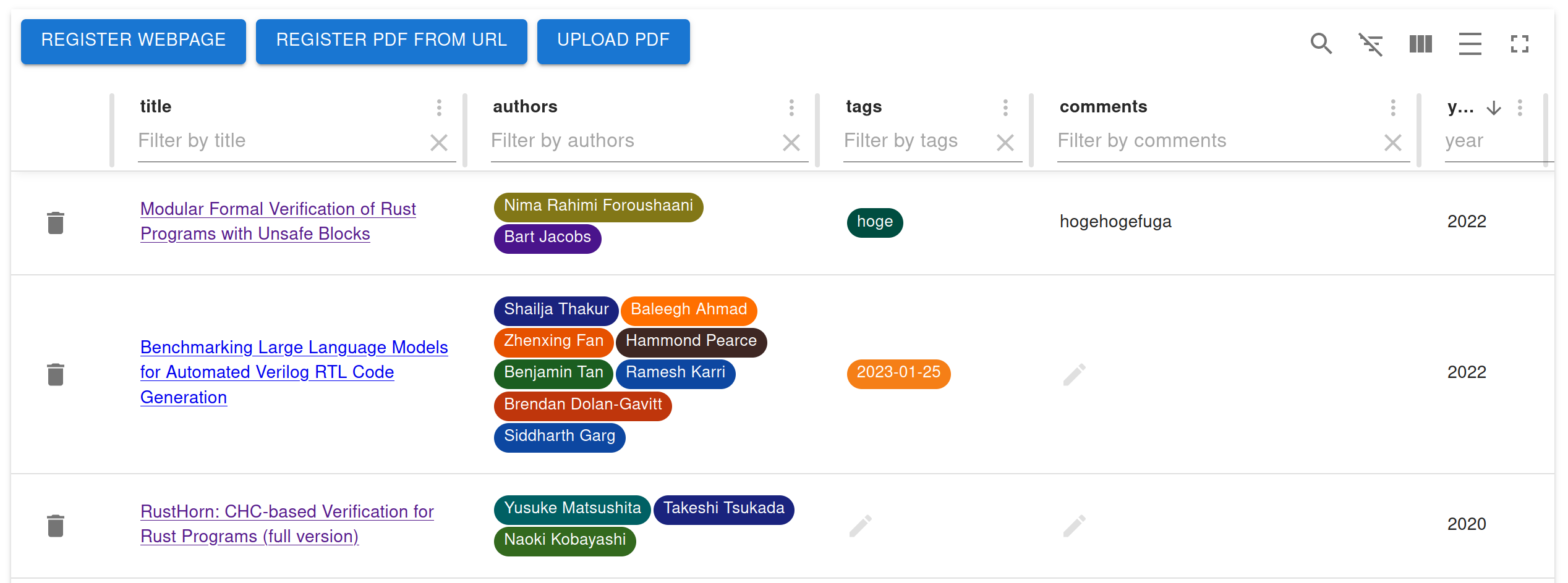 To address these challenges, I developed jendeley. It allows you to register both PDFs and webpages in the same database, making categorization easy through the use of tags. Moreover, the database is stored as a plain text JSON file, making it easily editable using your preferred editor. This means that even if jendeley's development process ends, you can still access your information and create alternative applications to manage it.