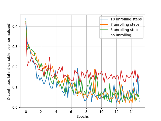 It can be also verified by looking at the plot of the Q loss for the continuous variables. As we can see the discrete variable loss goes to almost zero even with no unrolling(digits are separated vertically), so it is not plotted.