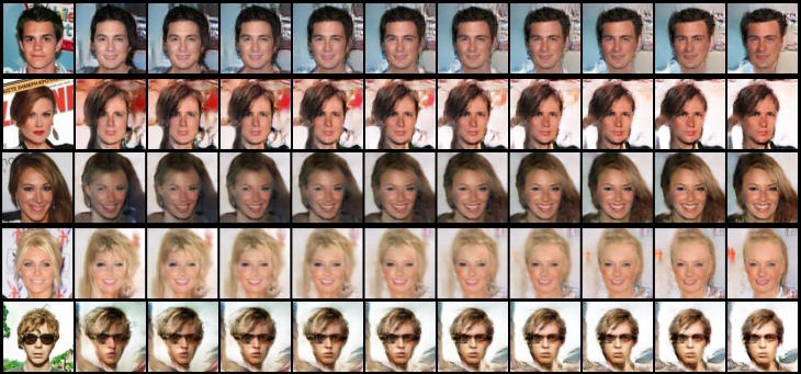 These are some samples obtained by varying the latent variables of a trained VAEInfoGAN model on the CelebA dataset:
