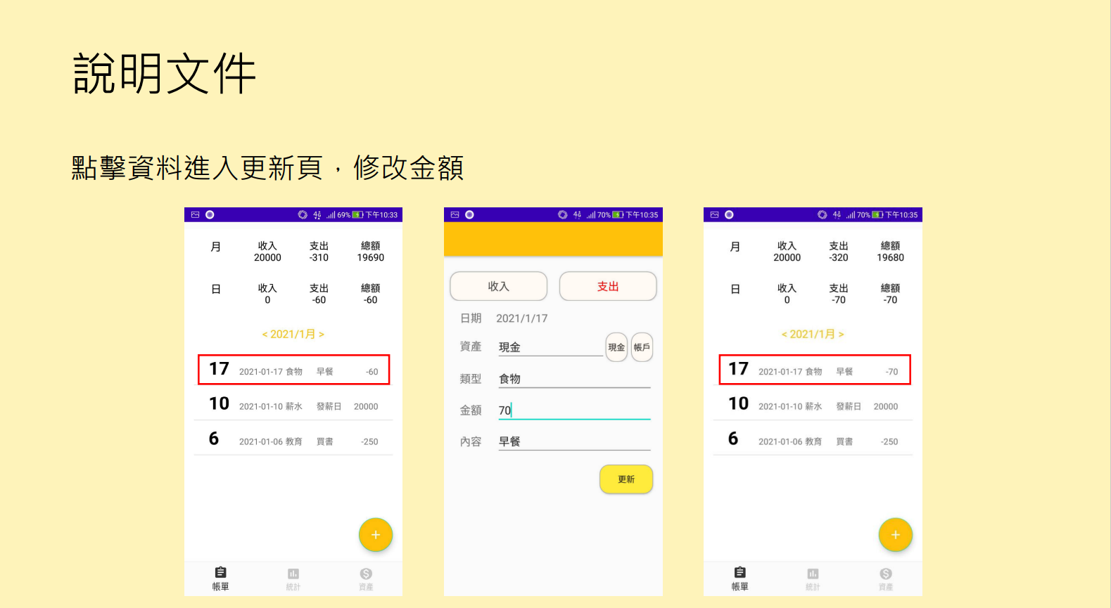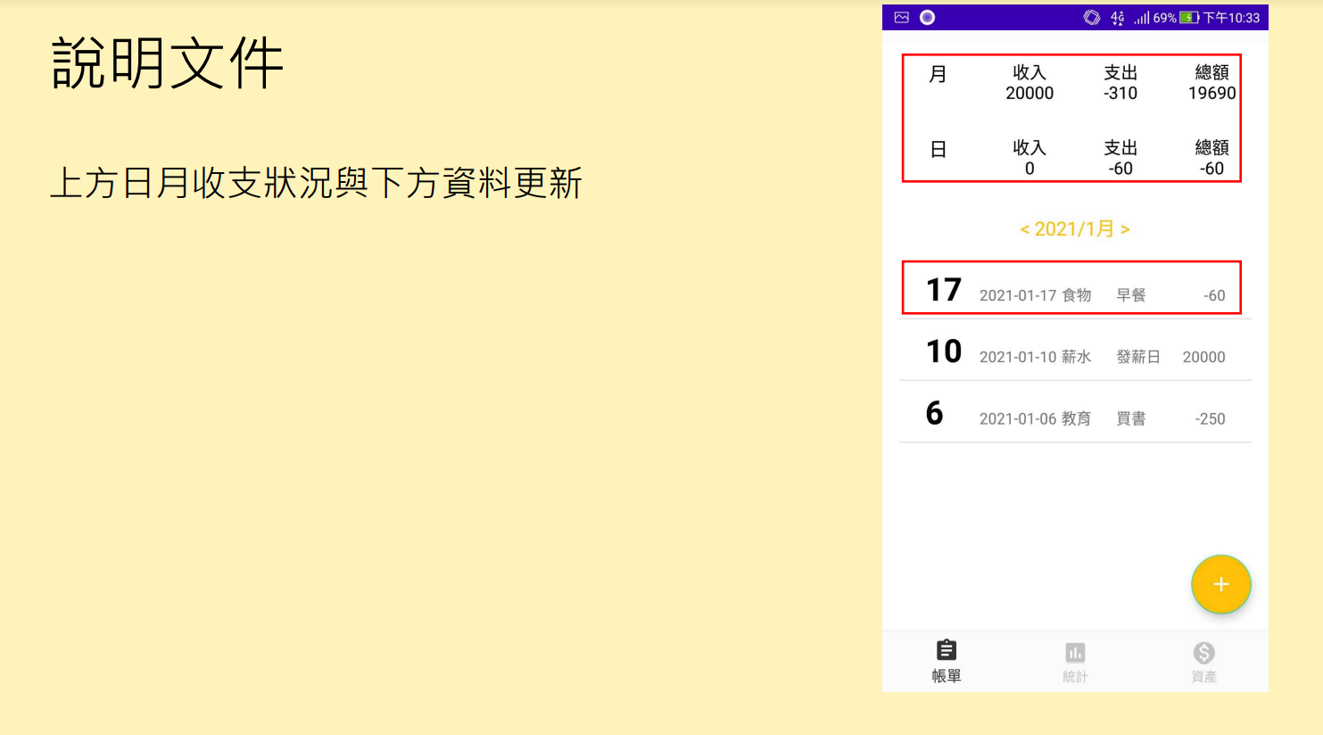 - 點擊下方新增按鈕可新增紀錄,有收支、新增日期、資產類型、金額、內容可以選填