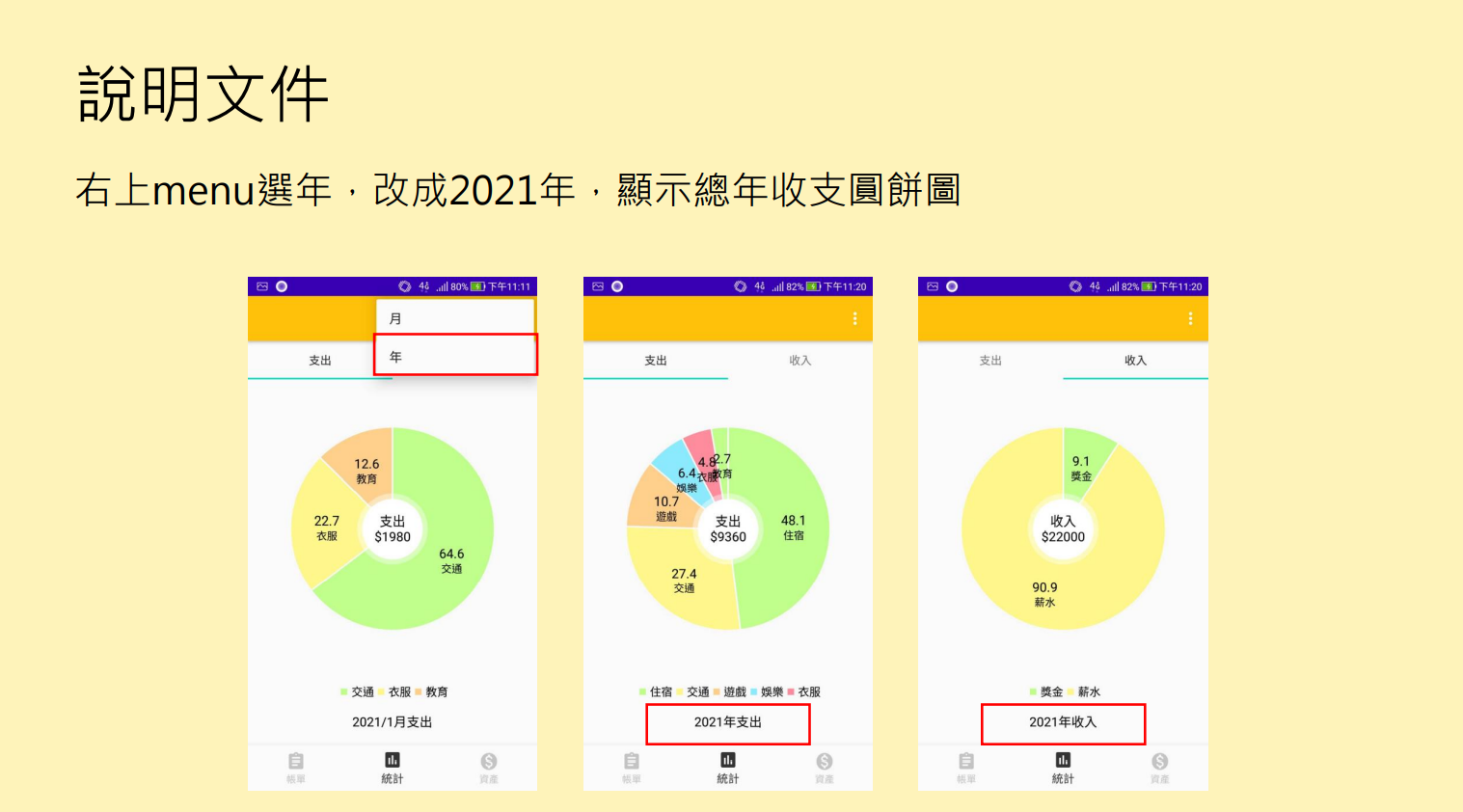 - 顯示該月的收支圓餅圖