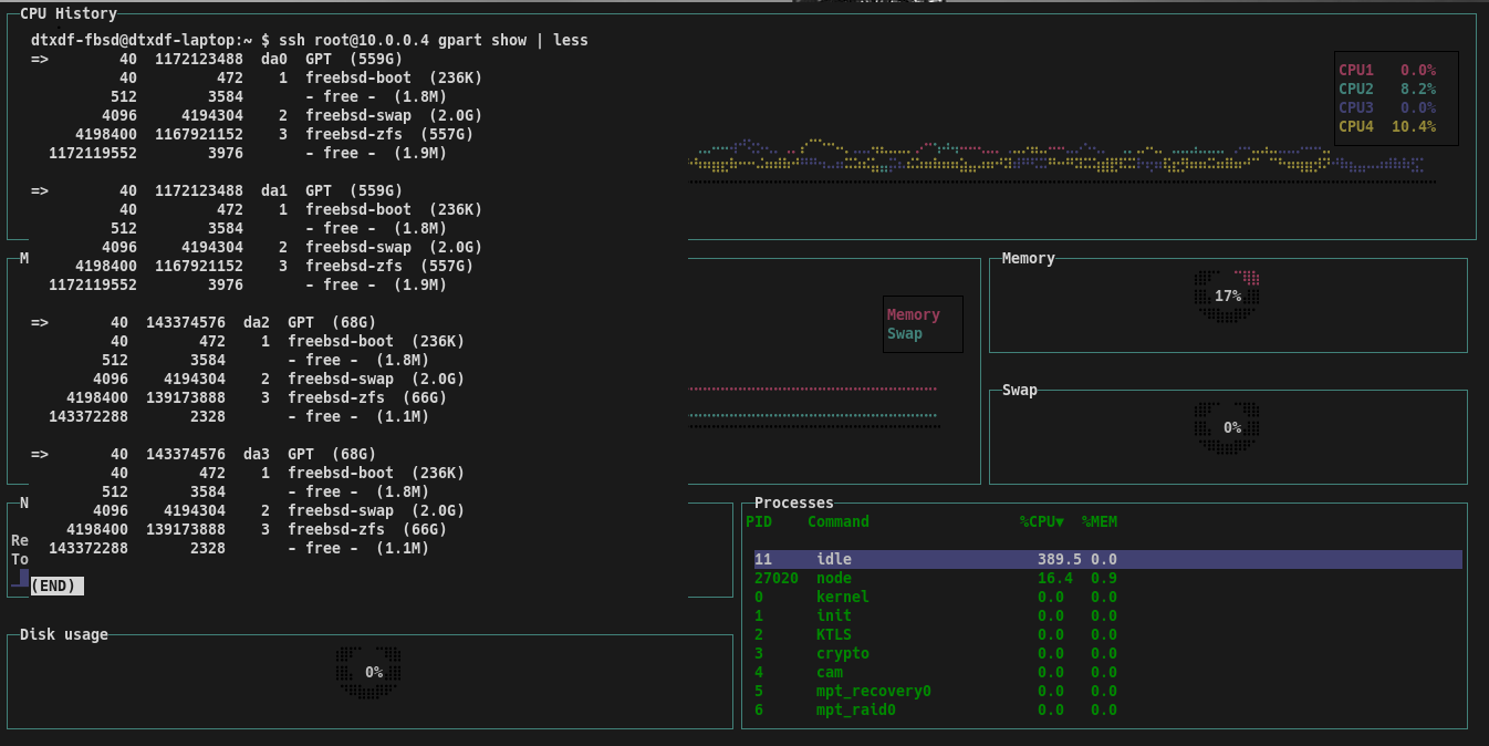 I have installed gtop using yarn on two machines. One with ZFS and the other with UFS. The first one shows disk usage at 0% and the second one shows disk usage correctly.