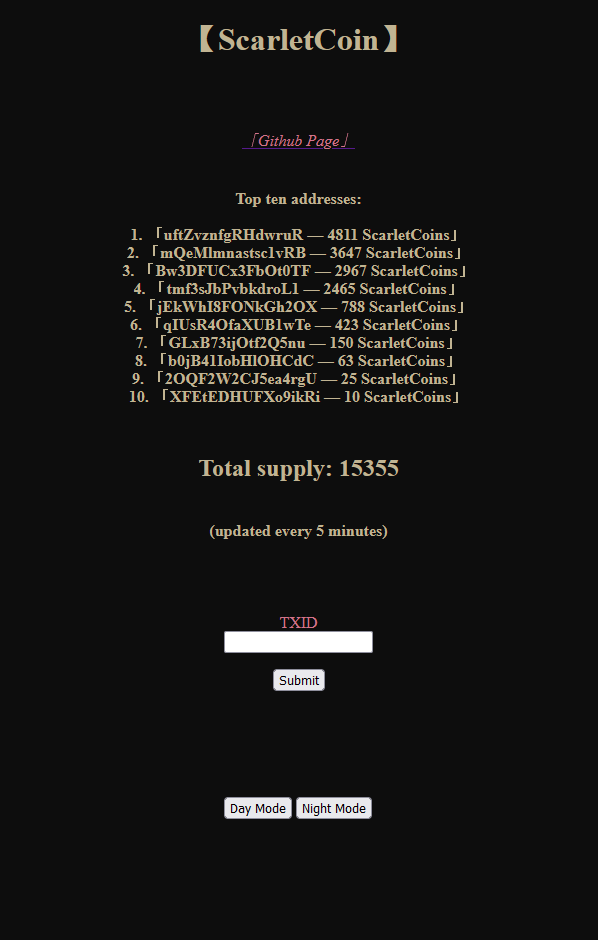 Each wallet will be rewarded with amount_of_coins/365/288 ScarletCoins every 300 seconds (5 minutes).