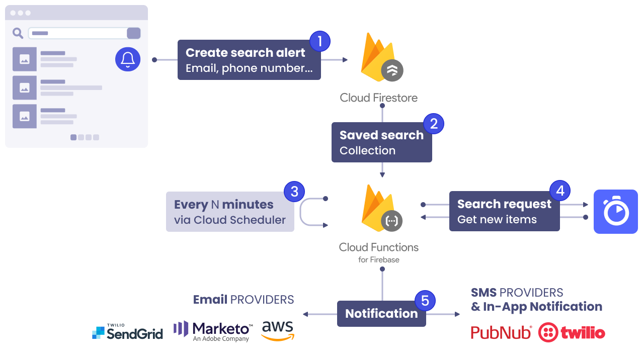 Using Firebase Schedule Functions, we regularly run the search (3) to find new matching items. We then notify the users via email, SMS, or In-App notifications (5), using providers like Twillio SMS Service, Twillio SendGrid, Amazon SES.