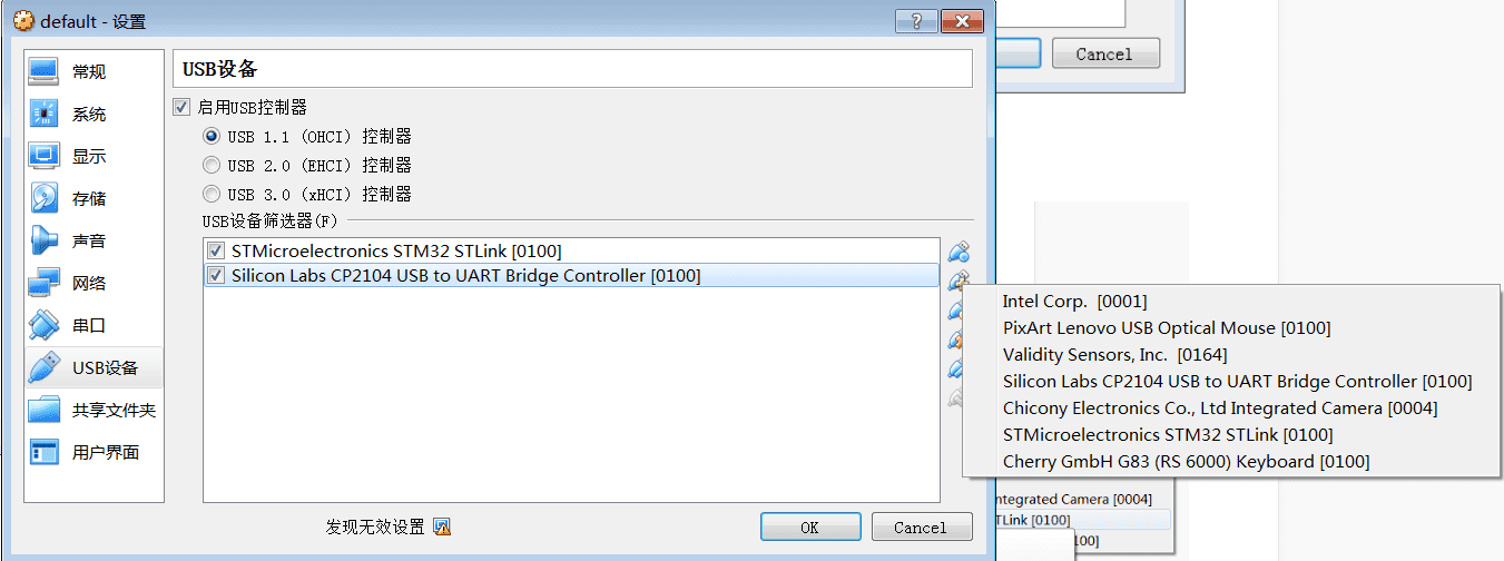 2)打开VirtualBox的管理界面,设置->usb设备->点选“启用usb控制器”->添加usb设备->确认