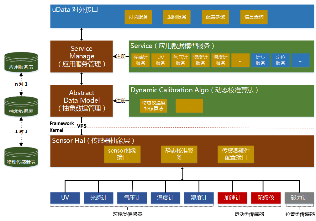 There are two layers in uData Framework. One is kernel layer, mainly responsible for sensor driving and related static calibration, including axial calibration. The other is framework layer, mainly responsible for application service management, dynamic calibration management and external module interfaces. The specific design of uData will not be unfolded in this document, but the following diagram can be used as a summary reference. This article will mainly introduce the development of sensor driver.