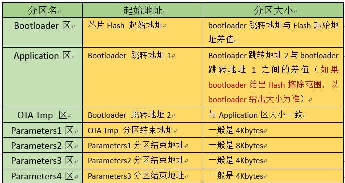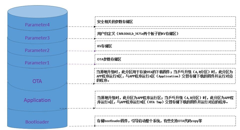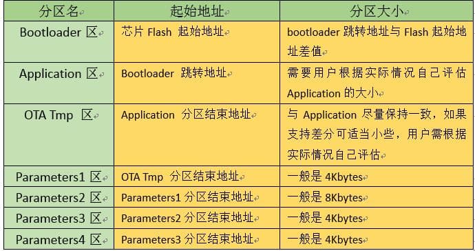AliOS Things 由于功能需要,维护了一张flash分区表,这张表包括bootloader区、Application区、OTA TMP区以及parameters区,如下图: