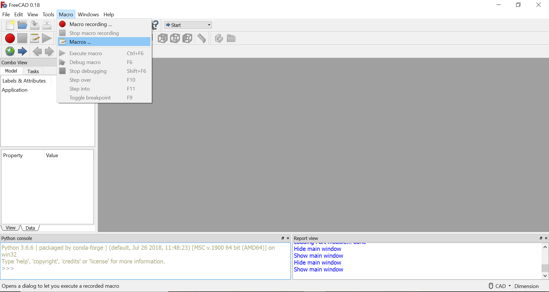 Step 2: Open FreeCAD 0.18 and navigate to the Macros Window