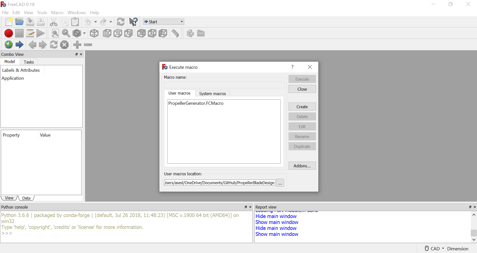 Step 4: Select the PropellerGenerator.FCMacro file and select "Execute"