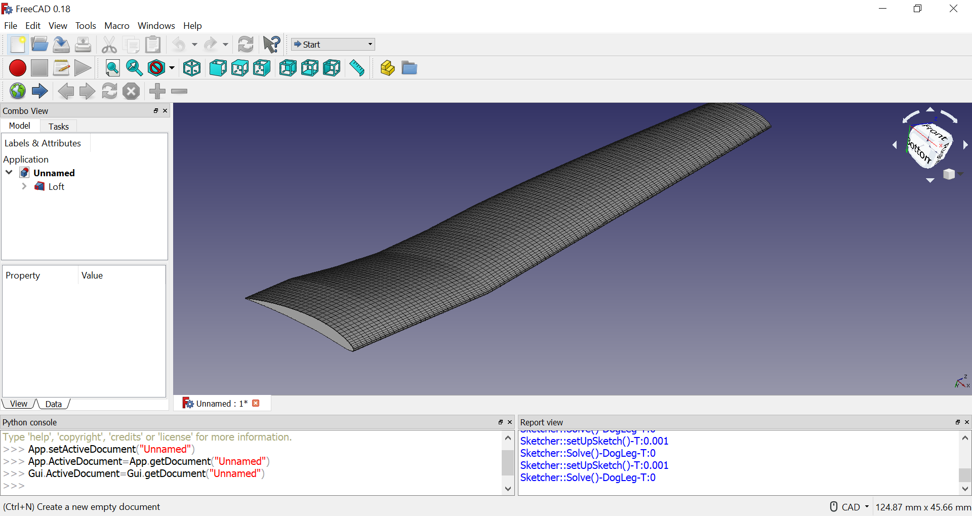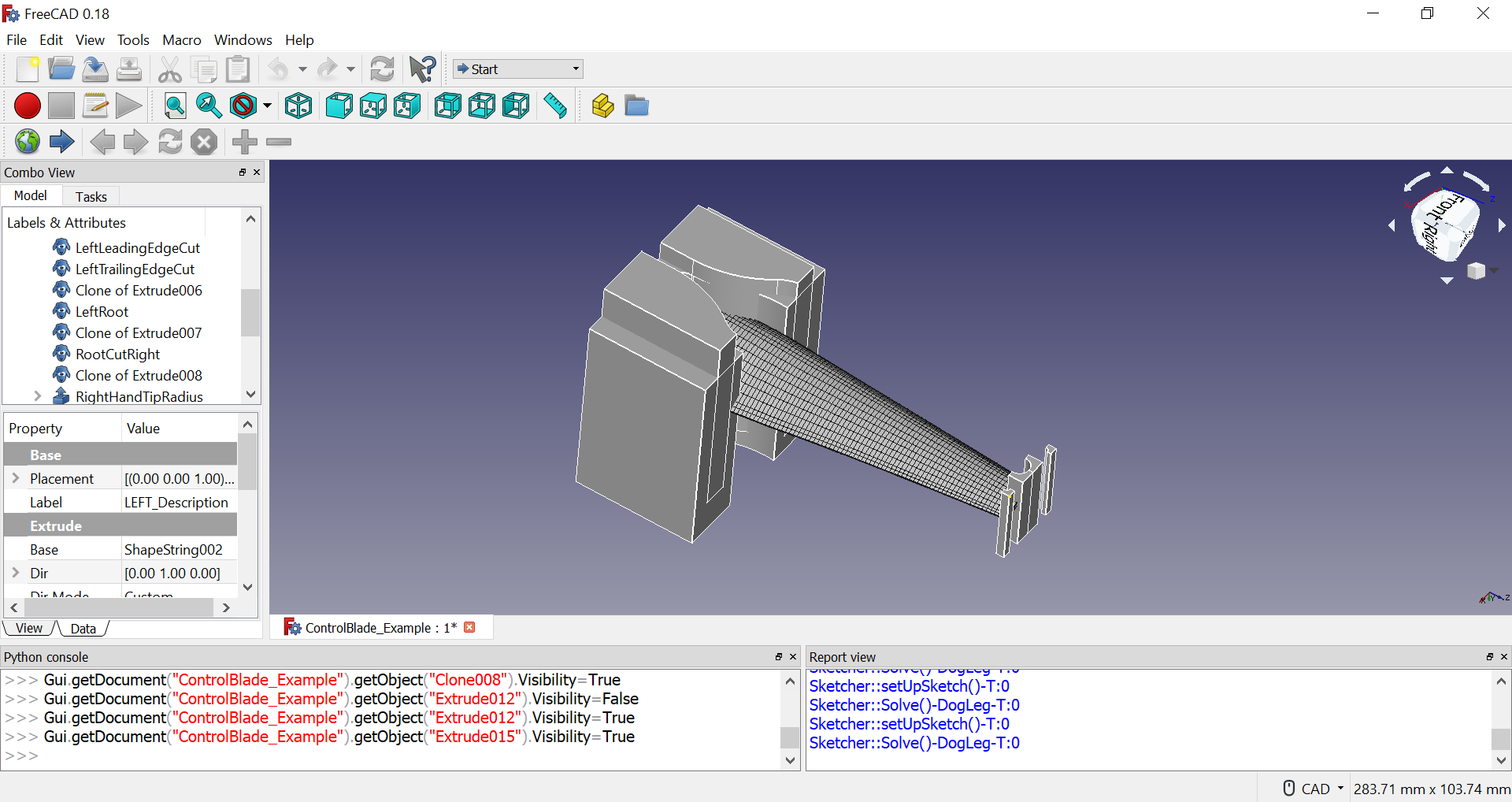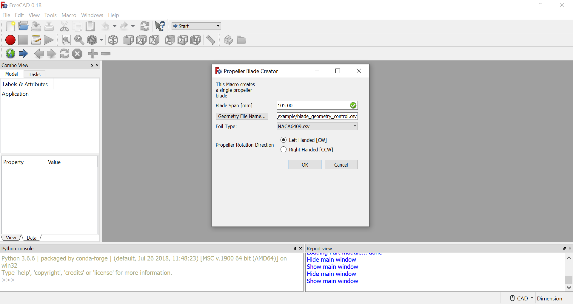 Copy the reference file, rename and open it to use with the Macro. After generating a blade, the FreeCAD file will look like this: