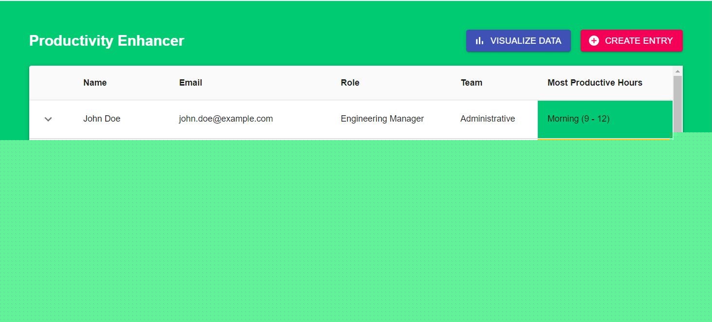 The Productivity Enhancer app asks the employees to fill a form during their joining with some basic details namely Name, Email, Team, Role along with the time frame during which they find themselves to be most productive. The time frame is currently classified into three categories:
