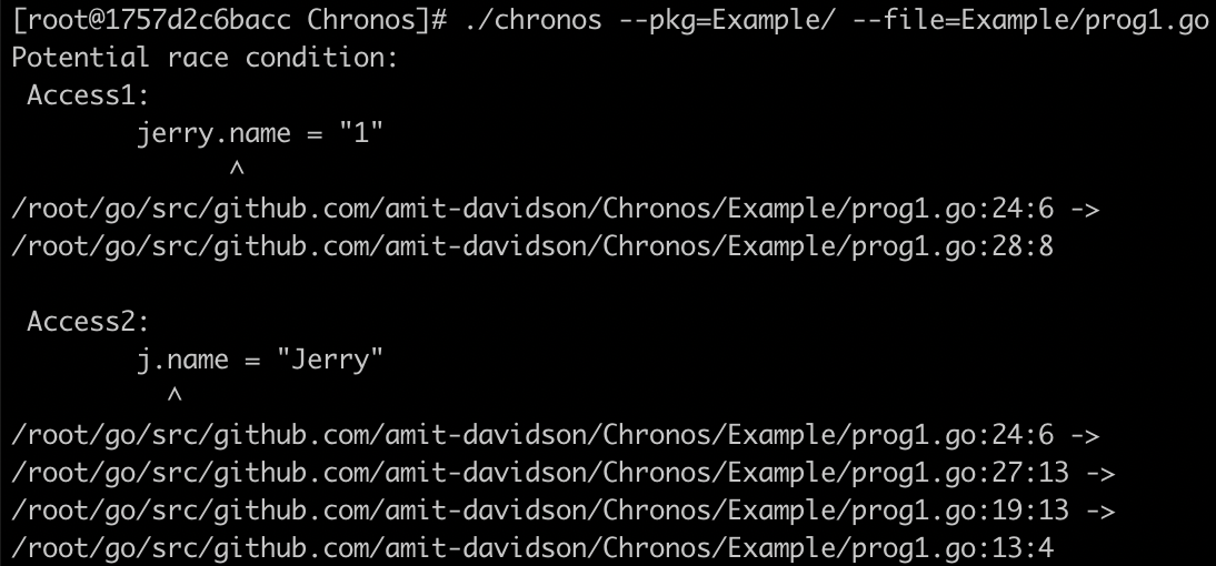 In contrast, Chronos managed to report only 244/403 = 60.5% of go race test cases. This can be explained by Chronos partial support with Go's features so this number will increase in the future. Also, it lacked due to his static nature where context/path sensitivity was required.