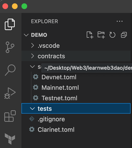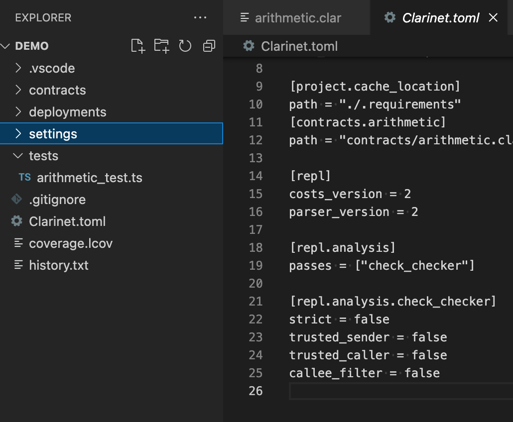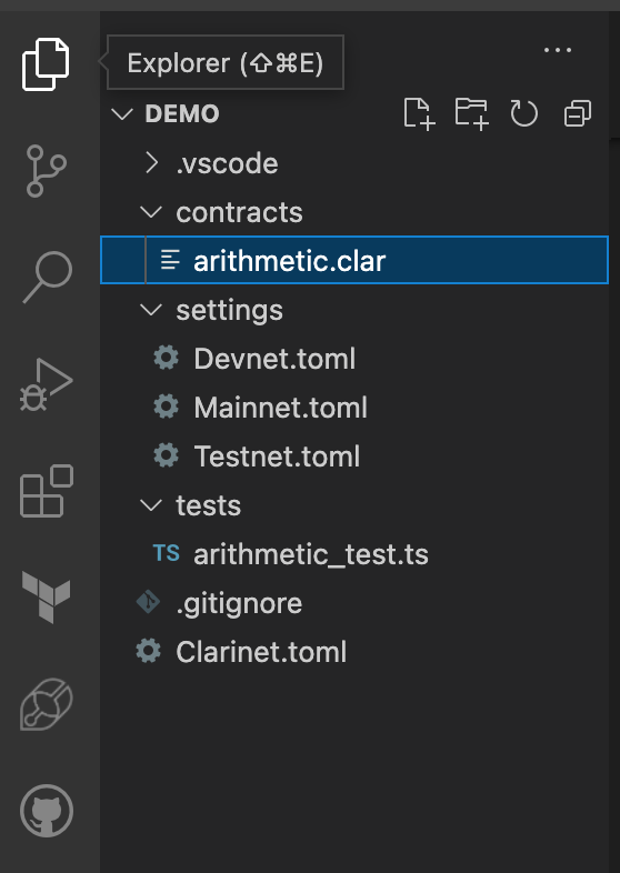 Notice that two files are created for you under the contracts and tests folders, arithmetic.clar and arithmetic_test.ts