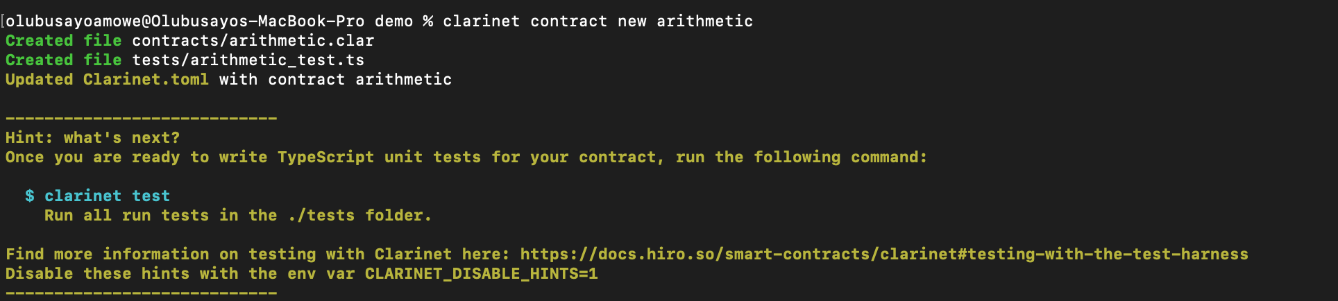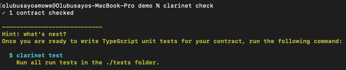 Congratulations:tada::tada::tada:! You have just created your first clarinet project. The beautuful thing about the clarinet console is that is give some hints on what to do for example in the image above, it gives hints around writing tests.