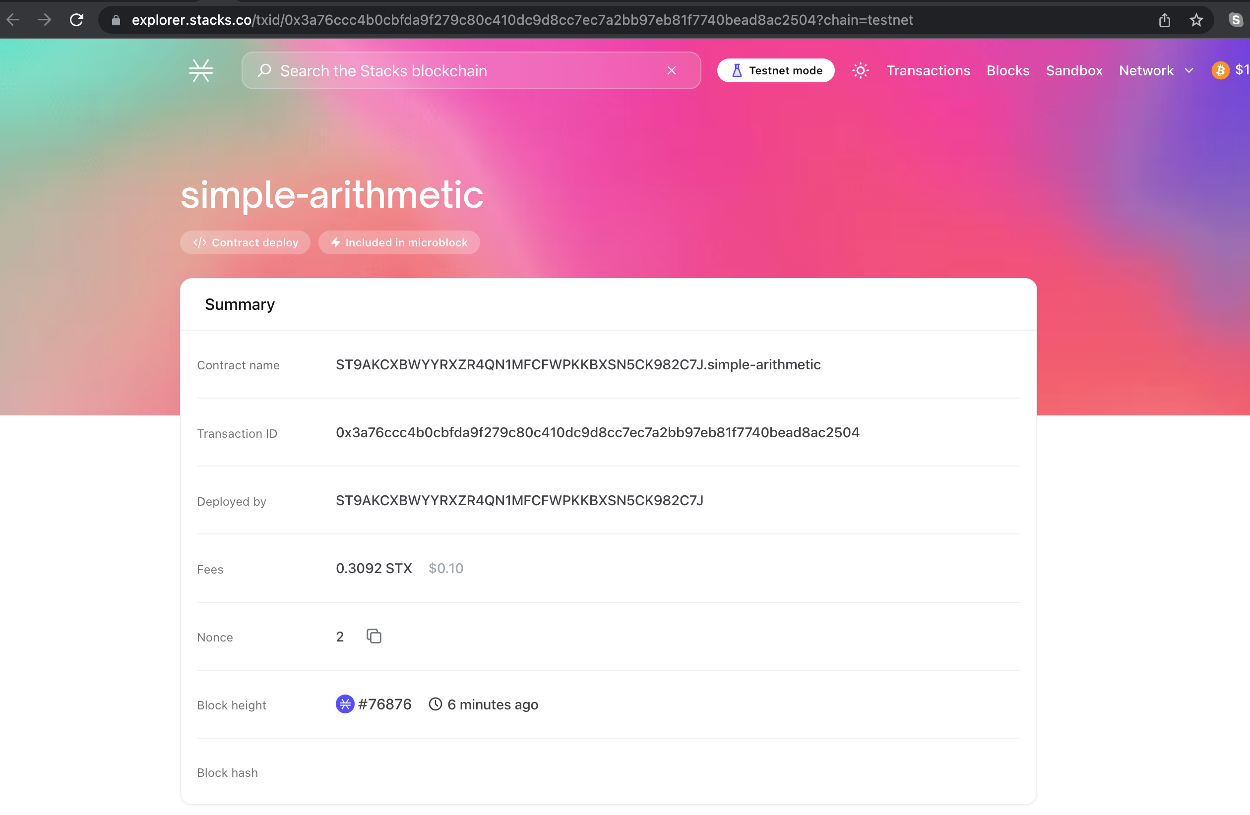 https://explorer.stacks.co/txid/0x3a76ccc4b0cbfda9f279c80c410dc9d8cc7ec7a2bb97eb81f7740bead8ac2504?chain=testnet