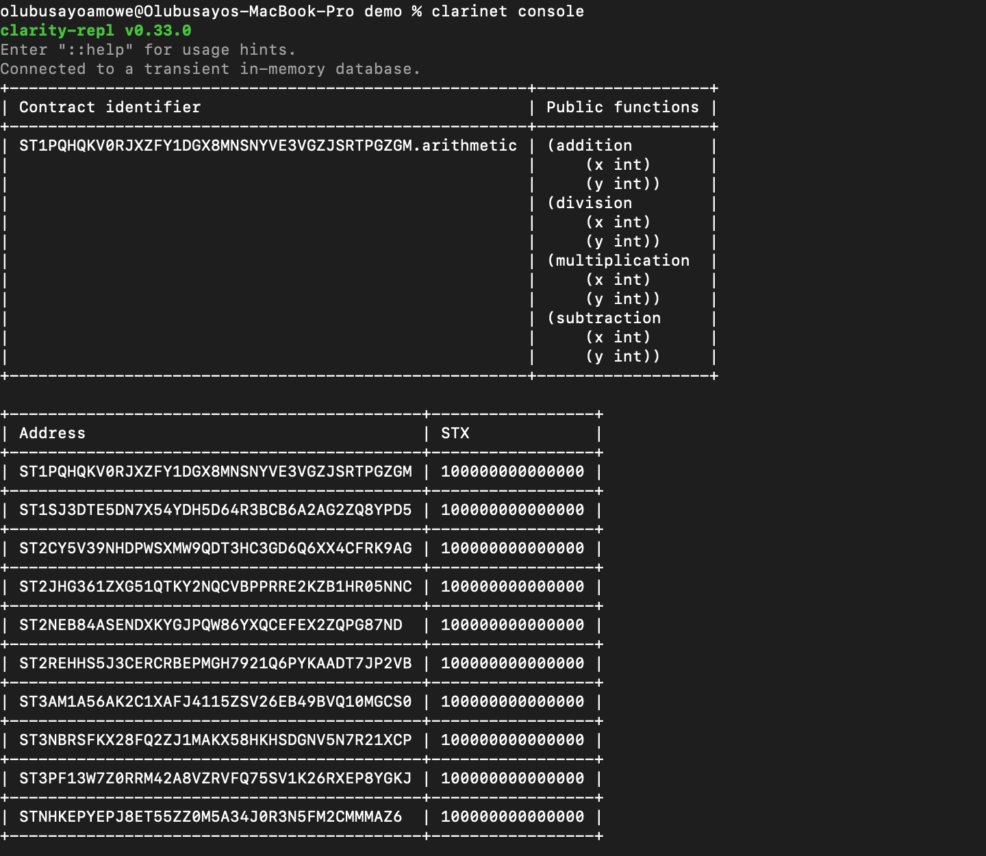 The Clarinet console is an interactive Clarity REPL that runs in-memory. Any contracts in the current project are automatically loaded into memory. If you want to load and test your contract in the console, run this command