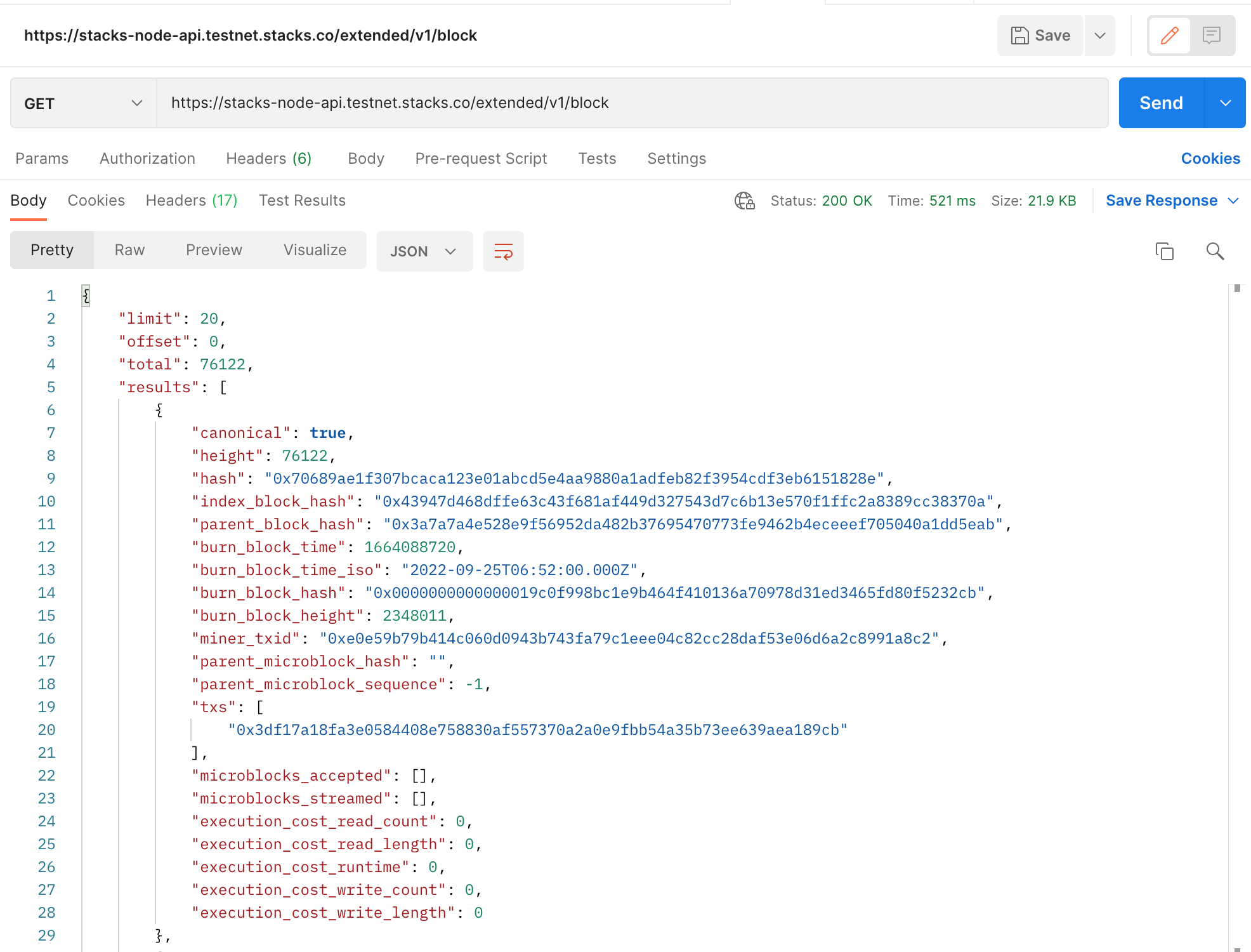 Select the GET method and type https://stacks-node-api.testnet.stacks.co/extended/v1/block into the url placeholder. Then press SEND