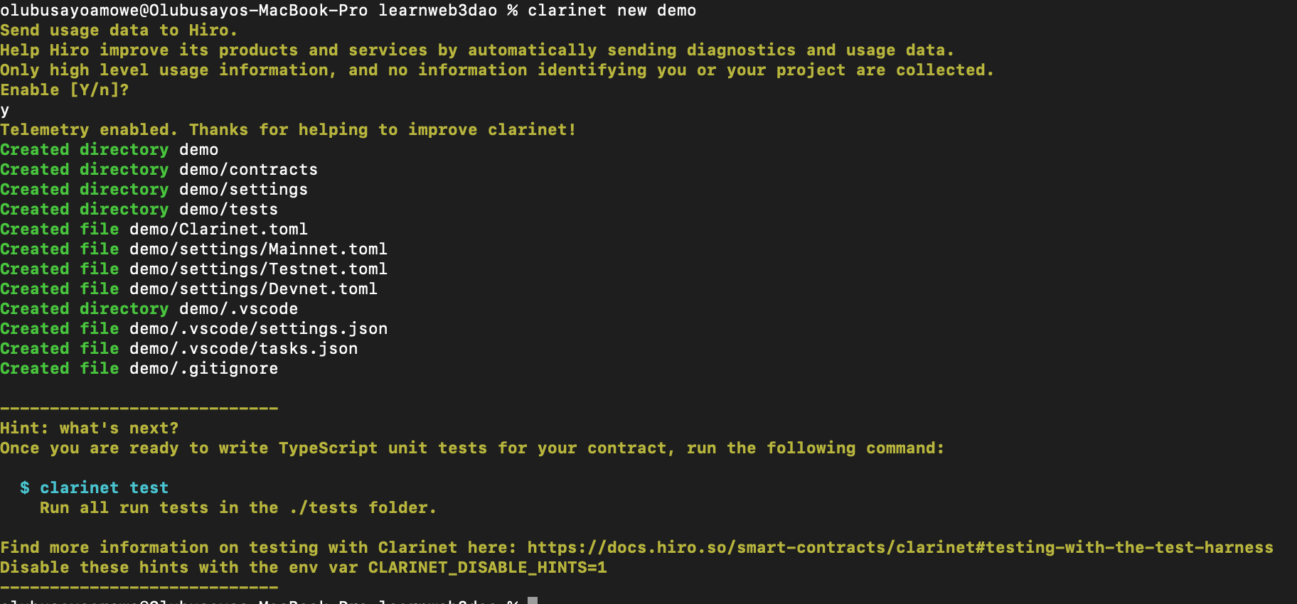 Optionally, you can enable telementry, this means sending the creators of Clarinet - Hiro diagnostics and usage data. Type 'Y' and enter.